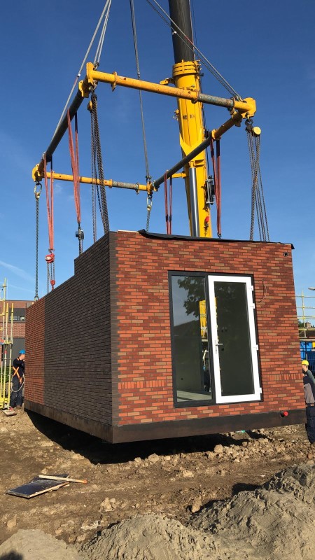 Foto 2 van 12 - Casco-elementen in de fabriek Foto 3 van 12 - Bouwplaats klaar voor het aanbrengen van de funderingspalen Foto 4 van 12 - Funderingspalen met opstorten gereed Foto 5 van 12 - Casco-element van de vrachtwagen Foto 6 van 12 - Plaatsen caso-element Foto 7 van 12 - Plaatsen caso-elementen op de funderingspalen Foto 8 van 12 - Plaatsen topgevels Foto 9 van 12 - Plaatsen kappen Foto 10 van 12 - Zonnepanelen Foto 11 van 12 - Bergingen Foto 12 van 12 - Eindresultaat